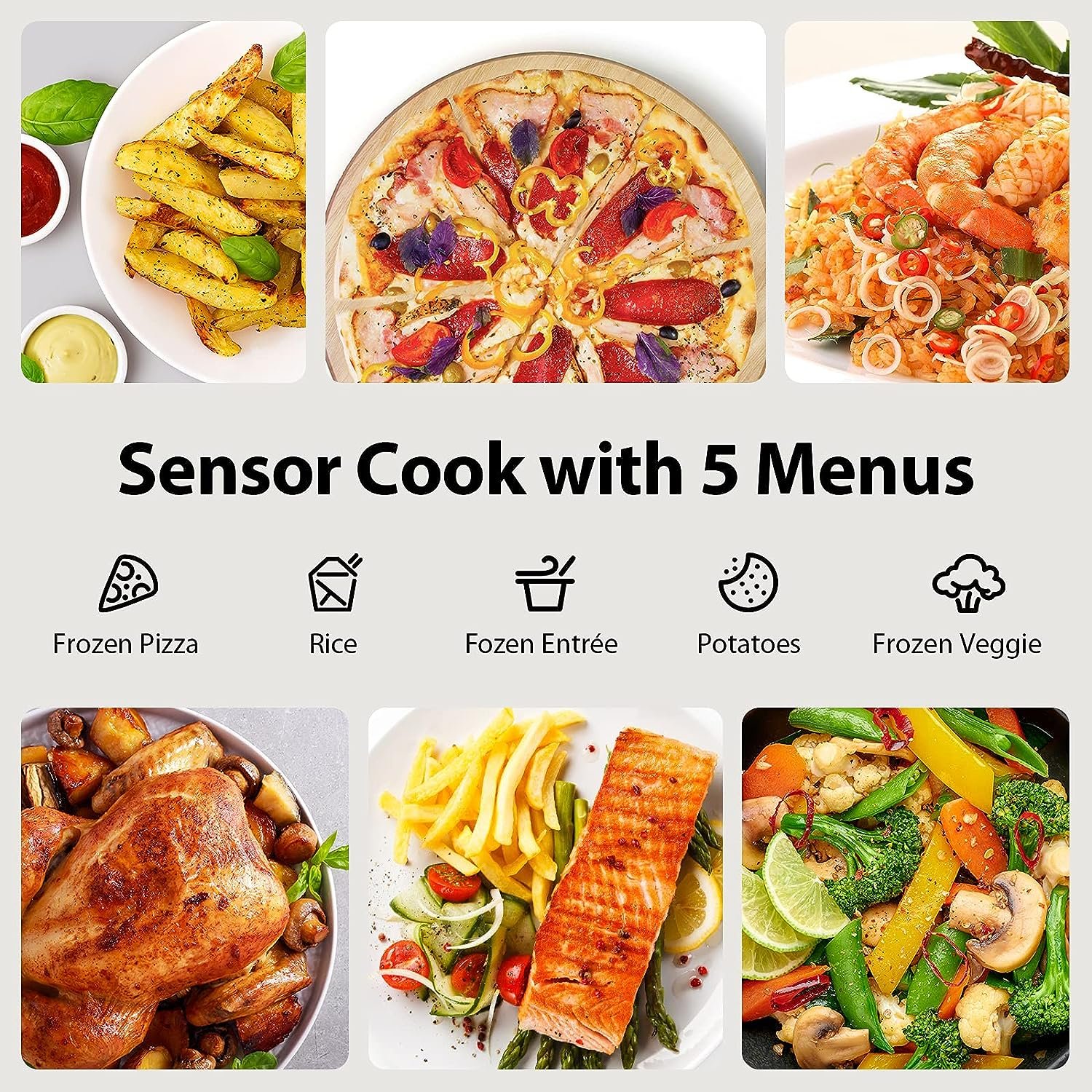 • 【Pre-programmed sensor menu】 for optimum heating of popular foods like pizza, potatoes, veggies and more; Power Wattage (Microwave): 1100W; Rated Voltage: 120V – 60Hz